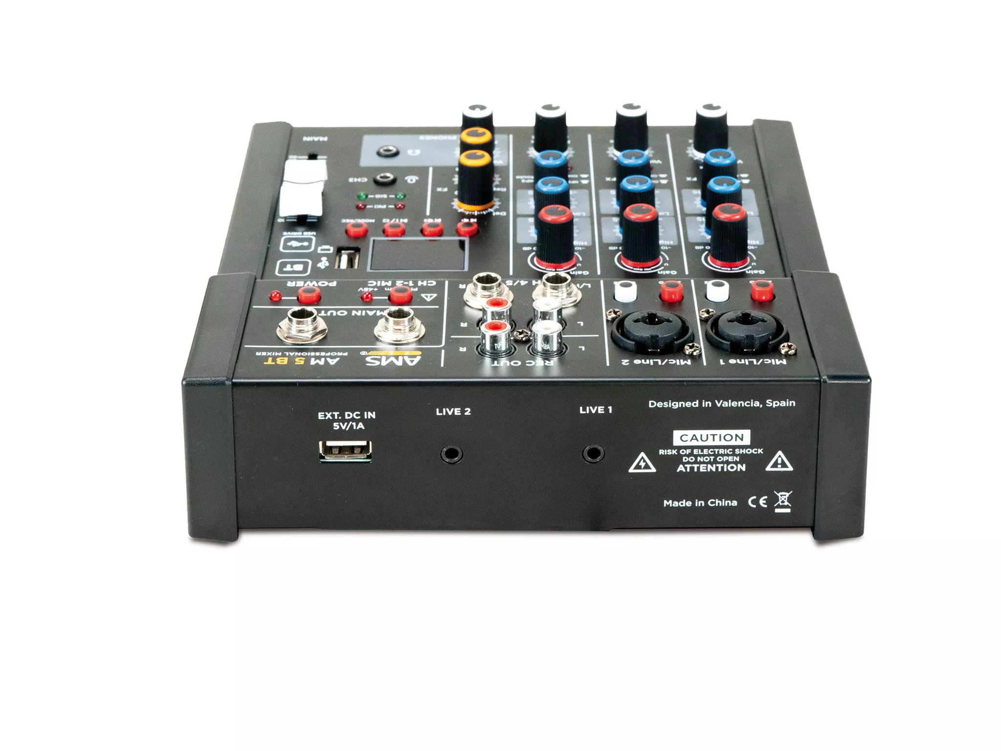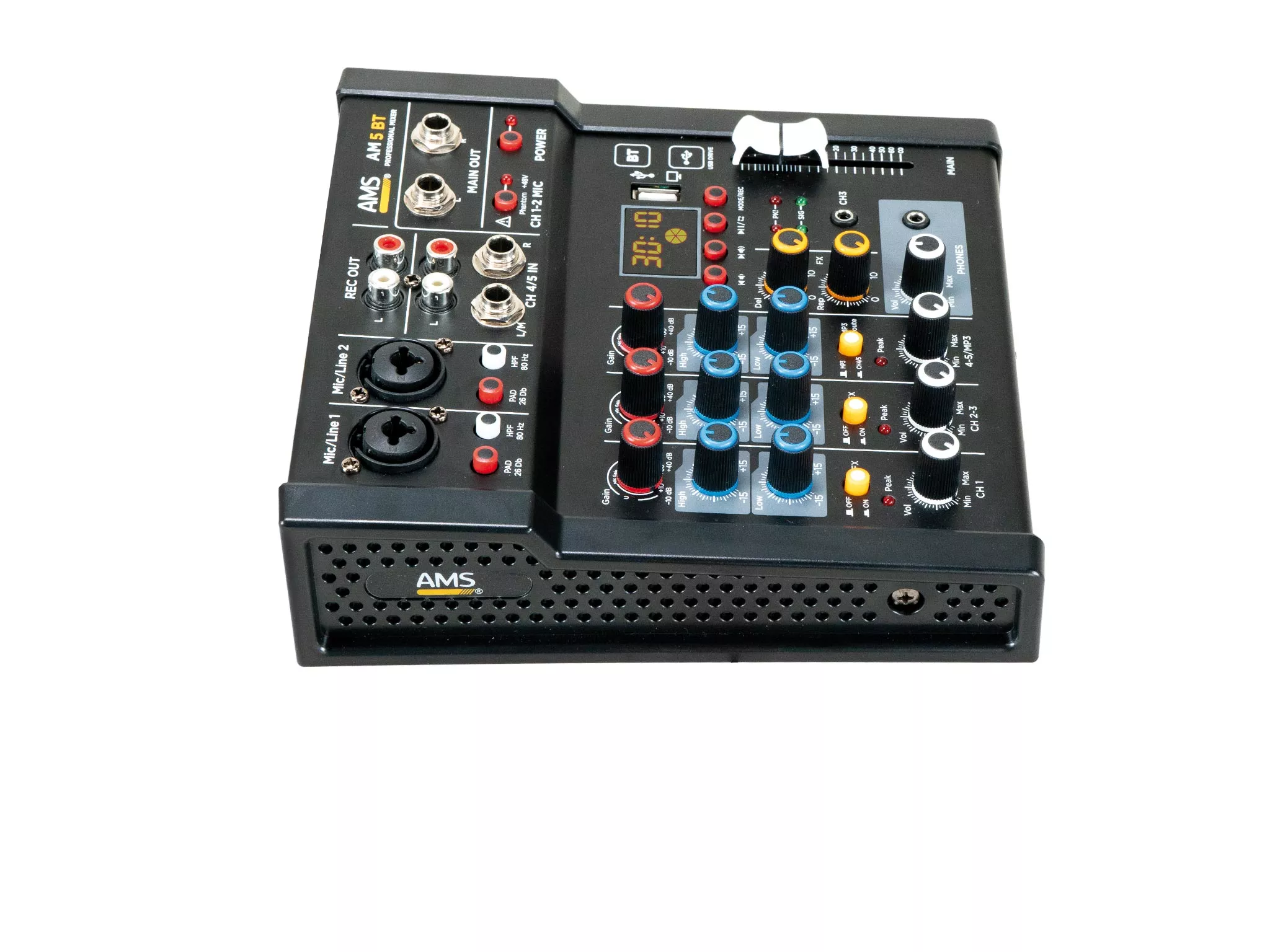 Client Sign UpAM 5 BT is an audio mixer with 2 mono MIC/LINE channels, 1 stereo channel and 1 additional Mic input. Its MIC/LINE input channels incorporate phantom power for condenser microphones. Also these inputs incorporate HPF and PAD switch to adequate the input levels.