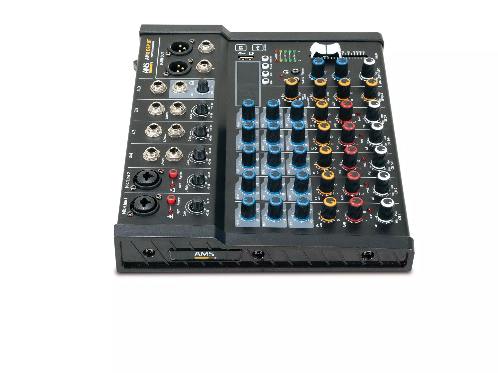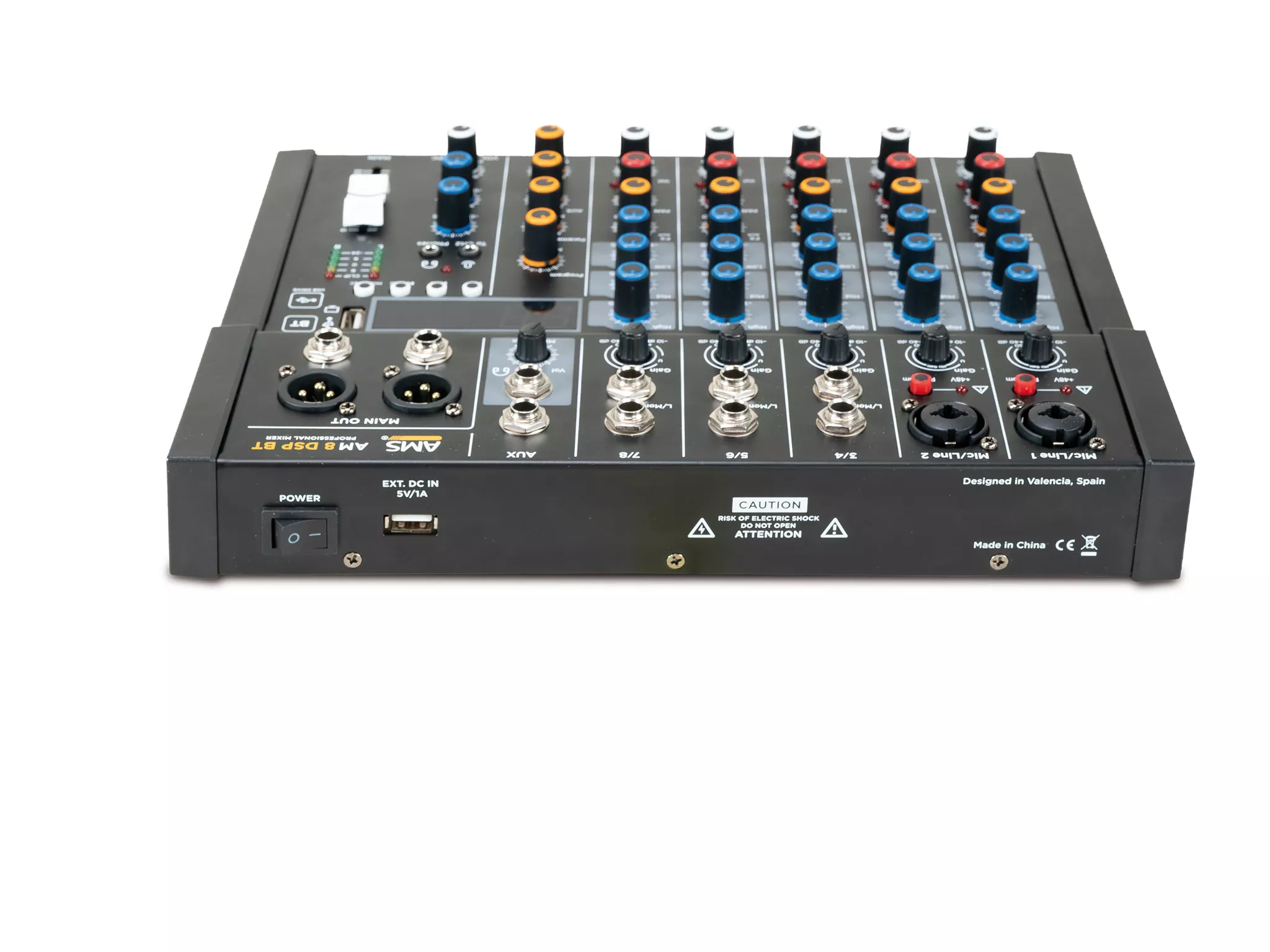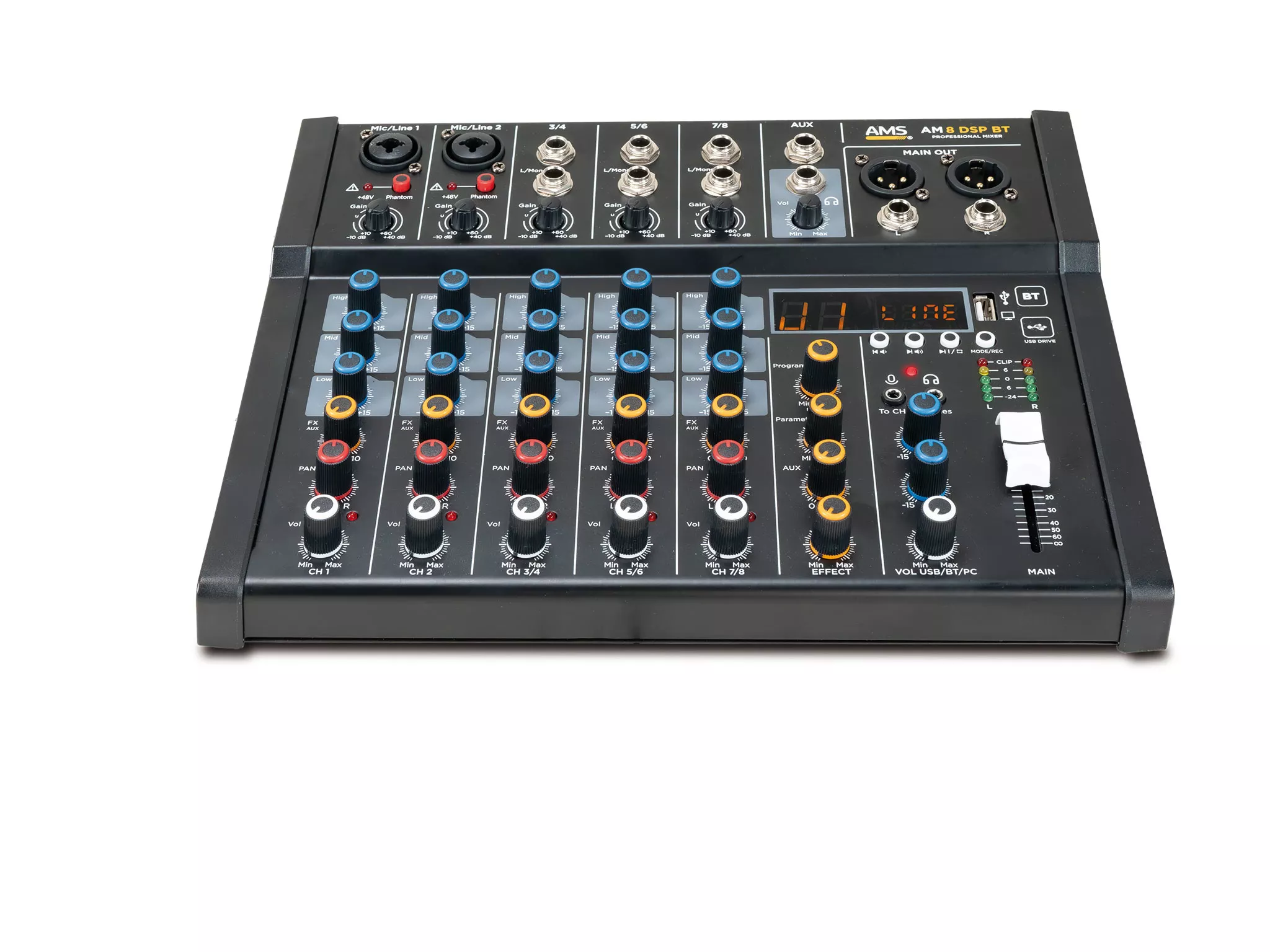 Client Sign UpAM 8 DSP BT is an audio mixer with 2 mono MIC/LINE channels and 4 stereo channels. Its MIC/LINE input channels incorporate phantom power for condenser microphones. It features an audio file player via USB with record function & Bluetooth port, built-in DSP with 22 effects, 3 tone controls per channel and headphone output. USB sound card function